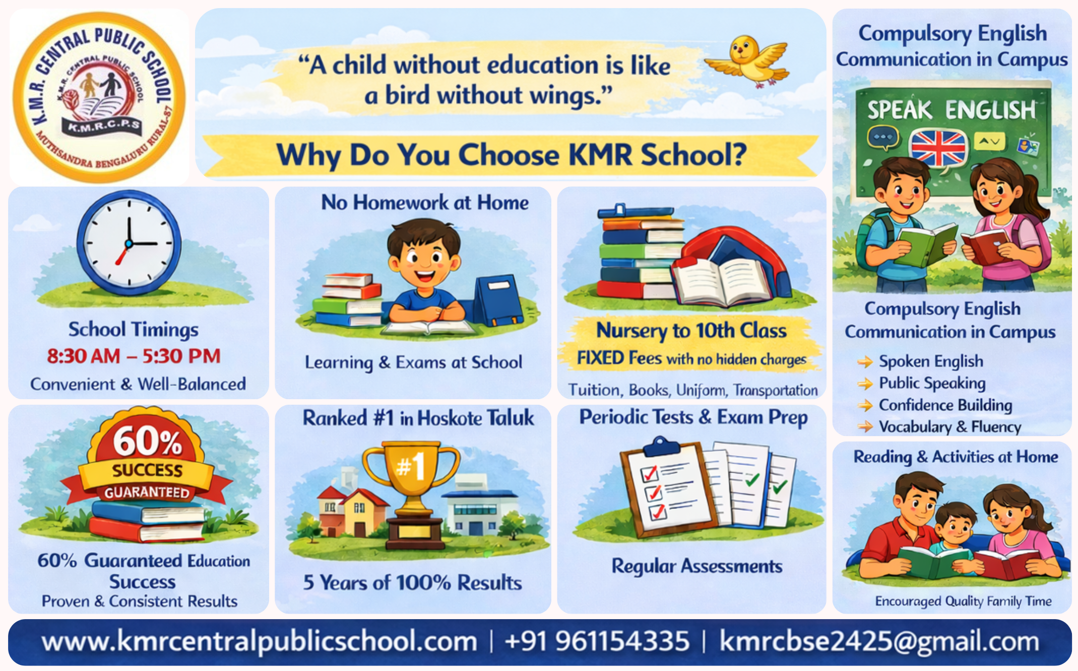 Established in 2014, KMR Central Public School is proudly located on Bellikere Road, Muthsandra, Bengaluru, and is committed to academic excellence. Serving students from Muthsandra, Bellikere, Bengaluru, and across Karnataka, the school has earned a reputation for delivering quality and transformative education.